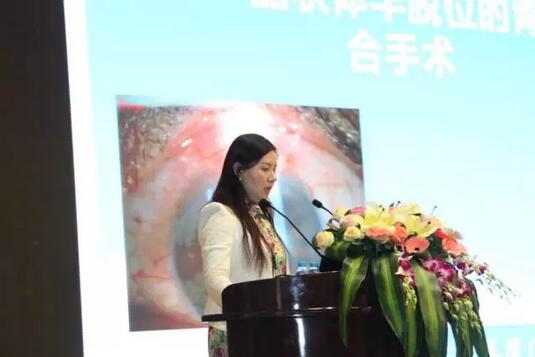 廈門大學(xué)附屬廈門眼科中心眼外傷學(xué)科帶頭人蔡錦紅主任在做“脈絡(luò)膜上腔出血的臨床治療選擇”報告。
