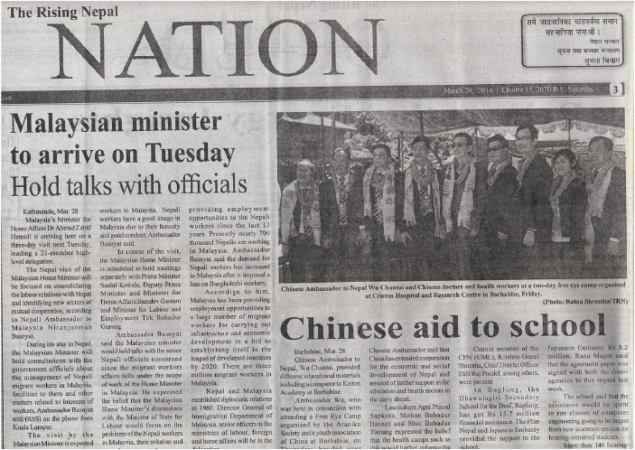 臨別前,吳大使對姚曉明博士說,尼泊爾是世界最不發(fā)達(dá)的國家,目前人均收入不到700美元,老百姓的生活相當(dāng)貧困,特別是其北部靠近中國邊境的喜馬拉雅山區(qū)域交通不便,醫(yī)療資源緊缺,這里的尼泊爾人民特別希望分享中國友鄰的經(jīng)濟(jì)發(fā)展成果。尼泊爾歷屆政府都堅持一個中國的原則,不允許任何勢力利用尼泊爾從事反華和藏獨(dú)活動。同時,我國也支持尼泊爾人民維護(hù)他們的主權(quán)和領(lǐng)土完整,兩國人民相互支持。我希望廈門眼科中心集團(tuán)的醫(yī)療專家能常來這里開展慈善活動,為尼泊爾人民送去光明,也為中國的安定作出貢獻(xiàn)。我們大使館將為慈善活動提供全力協(xié)助。