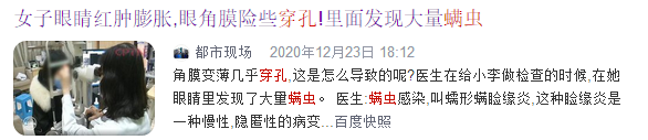 蠕形螨會引起睫毛異常,引發(fā)瞼緣炎性反應,瞼板腺堵塞,引起結膜炎、角膜炎等并發(fā)癥,嚴重的話將發(fā)生角膜穿孔致視力損傷甚至失明。