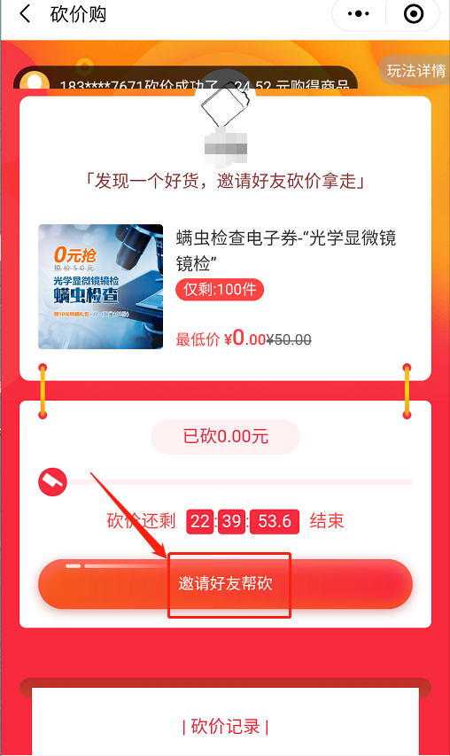 2、邀請10位好友助力砍價,即可0元享螨蟲鏡檢。