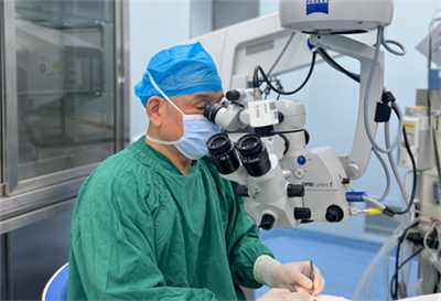 第二天,王大爺進入手術室,由吳護平院長操刀再次進行右眼的角膜移植手術。這次手術做的穿透性角膜移植,由于是二次移植,要考慮到移植片大小、中心等多方面因素,需要在取出原有的角膜植片后,再將完整健康的角膜組織縫合固定上去,十分考驗主刀醫(yī)生的經(jīng)驗和專業(yè)技術。