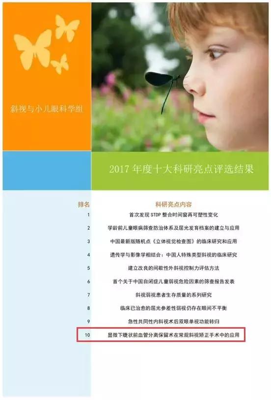 日前,由我院潘美華教授領(lǐng)銜的項(xiàng)目“顯微下睫狀前血管分離保留術(shù)在常規(guī)斜視矯正手術(shù)中的應(yīng)用”成功入選中華醫(yī)學(xué)會(huì)斜視與小兒眼科學(xué)組“2017年十大科研亮點(diǎn)”。