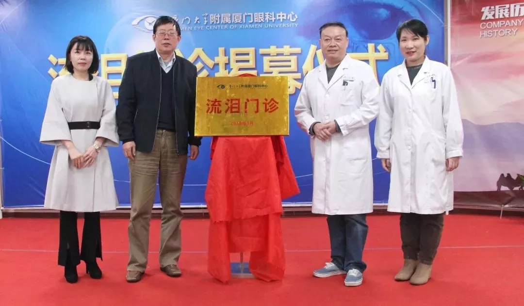 ▲廈門眼科中心業(yè)務(wù)院長(zhǎng)侯家敏、眼整形??茖W(xué)科周太平主任、淚道疾病專家鄧?yán)っ?、?zhí)行總經(jīng)理姚鄭玲玲等為流淚門診揭牌