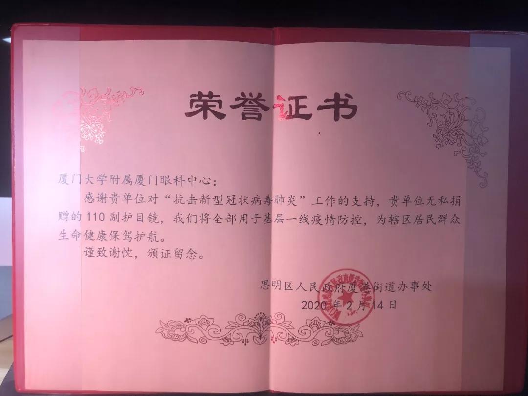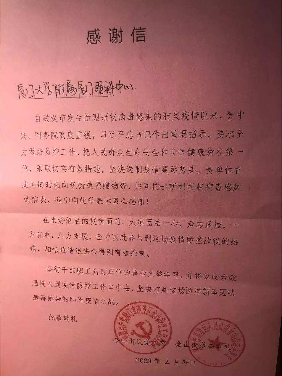 在中華街道辦,街道在LED大屏上打上了“感謝廈門大學(xué)附屬廈門眼科中心向中華街道捐贈護(hù)目鏡”;廈港街道辦為醫(yī)院頒發(fā)了榮譽(yù)證書;還有湖里街道辦、金山街道辦等街道也寫了一封封誠摯的感謝信。
