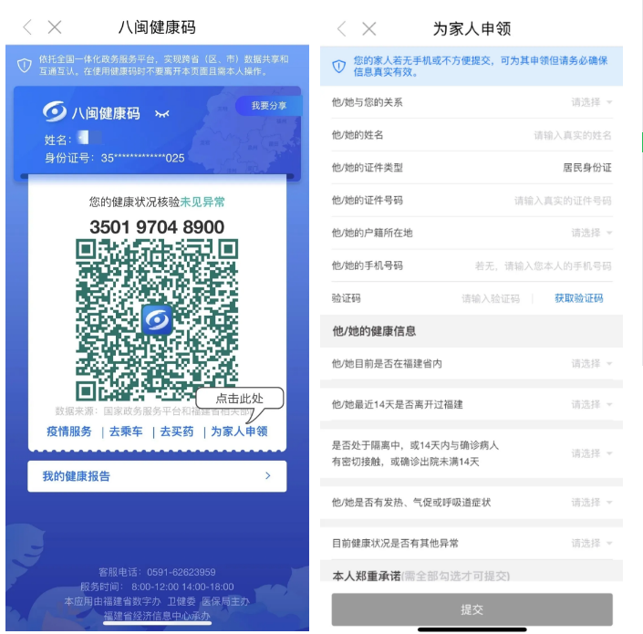 用戶實名登錄閩政通APP—進入“八閩健康碼”服務—選擇“為家人申領”—按要求填寫家人身份信息和健康信息。
