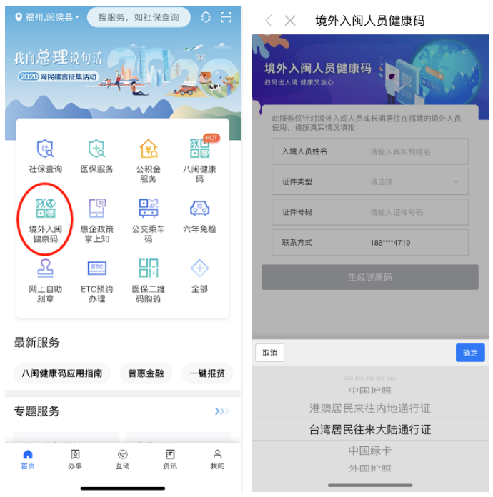 用戶登錄閩政通APP—進入“境外入閩健康碼”服務—按照要求填報姓名、證件類型、證件號碼和聯(lián)系方式等個人信息。