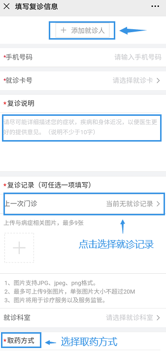 填寫就診人信息、復(fù)診說明,對(duì)醫(yī)生詳細(xì)描述目前的癥狀;在復(fù)診記錄中,可以添加往期復(fù)診記錄,以便醫(yī)生快速了解病史