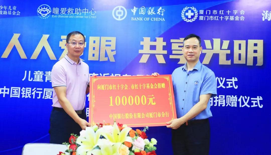活動(dòng)當(dāng)天,還舉辦了中國(guó)銀行股份有限公司廈門(mén)市分行、廈門(mén)市紅十字會(huì)光明捐贈(zèng)儀式。中國(guó)銀行廈門(mén)分行積極擔(dān)當(dāng)社會(huì)責(zé)任、履行社會(huì)義務(wù),在愛(ài)眼日來(lái)臨之際,向廈門(mén)市紅十字基金會(huì)捐贈(zèng)10萬(wàn)元,用于困難眼疾患者的救助。