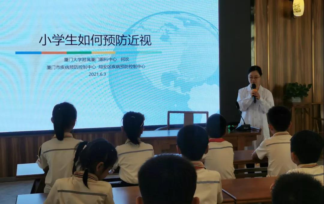 ▲廈門(mén)眼科中心斜視與小兒眼科副主任醫(yī)師何歡為小學(xué)生進(jìn)行近視防控科普