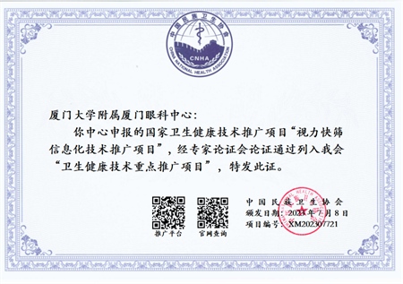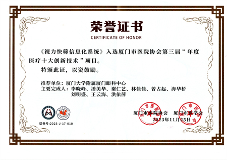 11月25日,在廈門市醫(yī)院協(xié)會第三屆年會暨“學科引領高質(zhì)量發(fā)展”學術會議上,廈門大學附屬廈門眼科中心“視力快篩信息化系統(tǒng)”榮獲廈門市醫(yī)院協(xié)會第三屆“年度醫(yī)療十大創(chuàng)新技術”項目,同時“視力快篩信息化技術推廣項目”經(jīng)國家衛(wèi)生健康技術應用推廣項目專家論證會論證,成功入選中國民族衛(wèi)生協(xié)會2023年度“衛(wèi)生健康技術重點推廣項目”。
