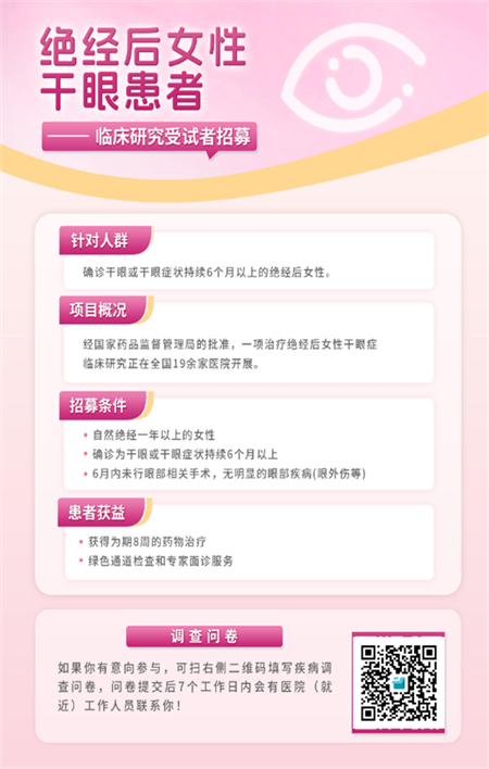 該項臨床研究的組長單位是廈門大學(xué)附屬眼科中心,主要負(fù)責(zé)人是劉祖國教授,針對的是確診干眼或干眼癥狀持續(xù)6個月以上的絕經(jīng)后女性。若符合招募條件,成功報名參與后您將獲得為期8周的藥物治療,以及綠色通道檢查和專家面診服務(wù)。