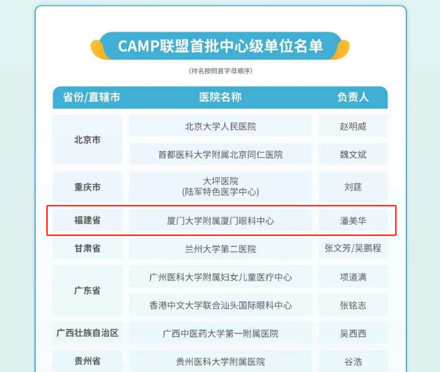 CAMP由國家眼部疾病臨床醫(yī)學(xué)研究中心牽頭組建,在健康中國戰(zhàn)略和近視防控政策的指引下,以持續(xù)提升基層眼健康服務(wù)能力為核心,旨在通過整合眼科醫(yī)療資源、科研力量和臨床經(jīng)驗,聚力構(gòu)建一個高效、協(xié)同、創(chuàng)新的近視防控服務(wù)體系和覆蓋全國的眼健康醫(yī)療服務(wù)網(wǎng)絡(luò)。聯(lián)盟啟動報名后,共有來自29個省和直轄市的434家醫(yī)療機(jī)構(gòu)報名,其中報名參選中心級單位的有108家,最終遴選出首批中心級單位33家。此次廈門大學(xué)附屬廈門眼科中心成功獲選為中心級單位,標(biāo)志著醫(yī)院在國內(nèi)眼科領(lǐng)域尤其是近視防控領(lǐng)域具有顯著的影響力和專業(yè)能力,是聯(lián)盟推進(jìn)近視防控工作的重要力量。