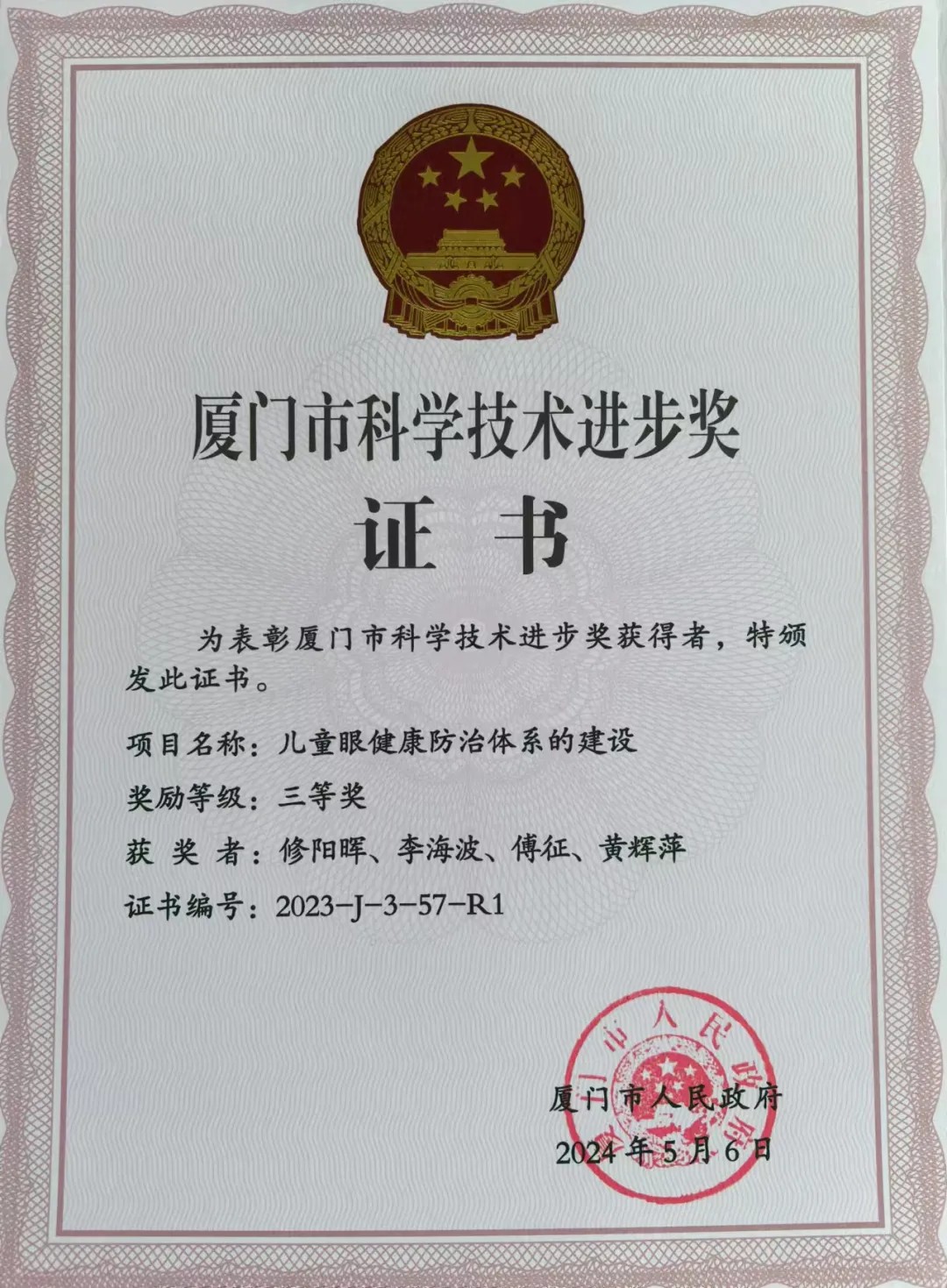 12月16日,廈門市科學(xué)技術(shù)大會在廈門人民會堂隆重舉行,大會現(xiàn)場為獲得2023年度廈門市科學(xué)技術(shù)獎的科研人員代表頒獎。由廈門眼科中心作為第一完成單位,斜視與小兒眼科修陽暉博士、眼外傷及眼底2科李海波博士所在團(tuán)隊共同完成的“兒童眼健康防治體系的建設(shè)”項目喜獲廈門市科學(xué)技術(shù)進(jìn)步獎三等獎,修陽暉博士應(yīng)邀出席盛典并代表科研團(tuán)隊領(lǐng)獎。