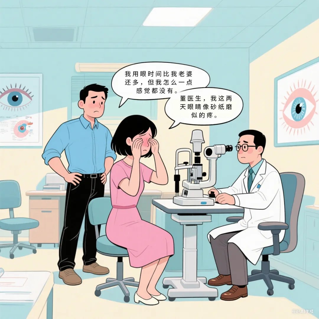 剛結(jié)束加班的設(shè)計(jì)師麗麗不停揉著發(fā)紅的眼睛:"董醫(yī)生,我這兩天眼睛像砂紙磨似的疼。"而陪她來的程序員丈夫阿強(qiáng)插話:"我用眼時間比我老婆還多,但我怎么一點(diǎn)感覺都沒有。"