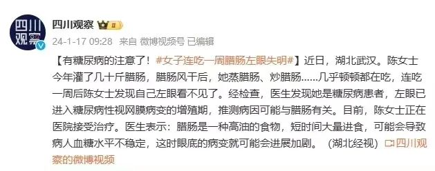 近日,湖北武漢陳女士連吃一周臘腸后左眼失明,經(jīng)檢查確診糖尿病視網(wǎng)膜病變,并且已經(jīng)進入增殖期。