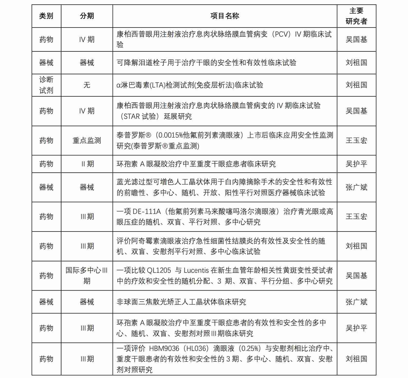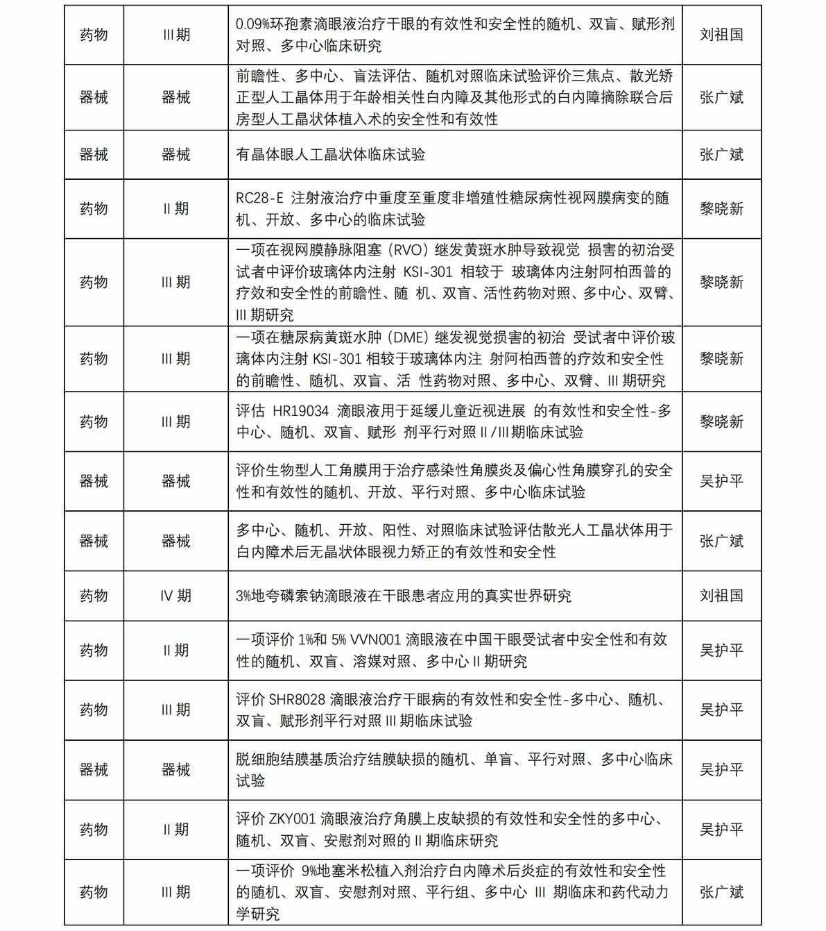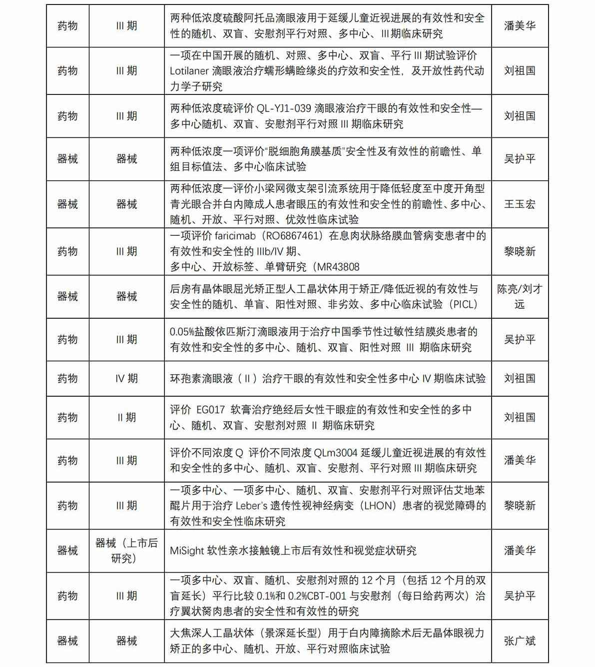 廈門大學(xué)附屬廈門眼科中心藥物臨床試驗(yàn)機(jī)構(gòu)(以下簡稱“機(jī)構(gòu)”)于 2017 年獲得國家藥物臨床試驗(yàn)(眼科專業(yè))資格。機(jī)構(gòu)可承擔(dān)新藥Ⅱ、Ⅲ、Ⅳ期臨床試驗(yàn),也是承擔(dān)醫(yī)療器械、體外 診斷試劑的重要研究機(jī)構(gòu)。從獲批至今,機(jī)構(gòu)已承接臨床試驗(yàn)項(xiàng)目共計(jì) 45 項(xiàng)(包含藥物臨床試驗(yàn)項(xiàng)目 31 項(xiàng),器械臨床試驗(yàn)項(xiàng)目 13 項(xiàng) ,體外診斷試劑試驗(yàn)項(xiàng)目 1 項(xiàng)), 由本中心作為組長單位牽頭的項(xiàng)目共計(jì) 8 項(xiàng)。