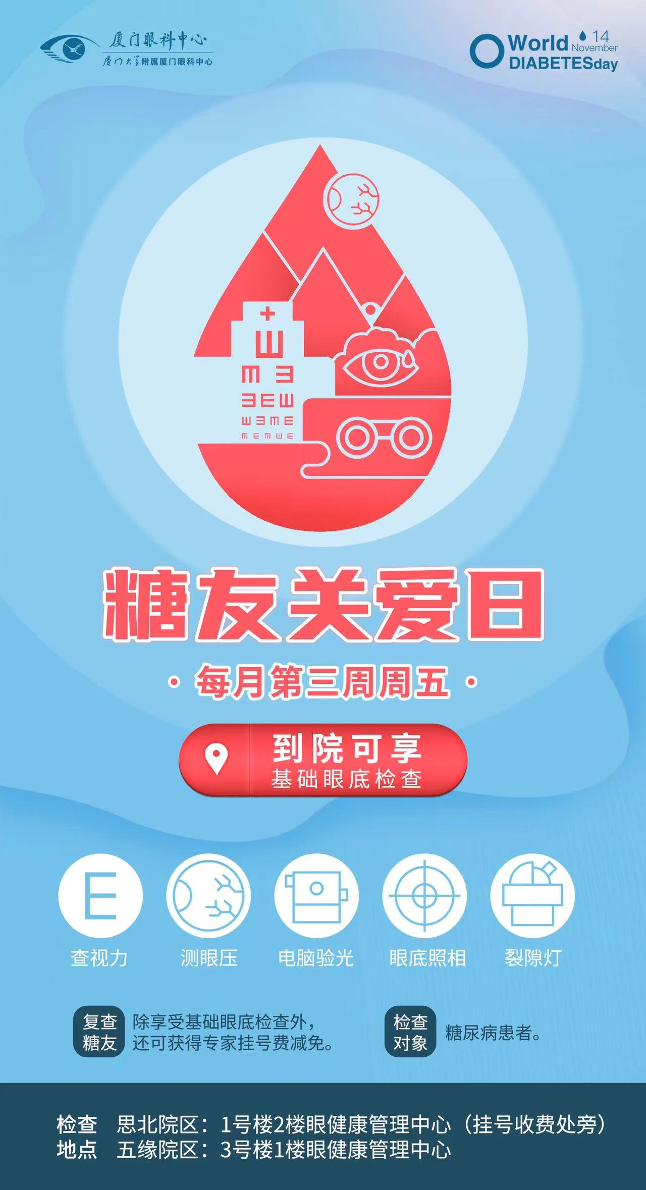 廈門眼科中心暖心設立糖友關愛日,每月第三周的周五糖尿病患者憑糖尿病診斷到院,即可免費享受雙重驚喜福利。