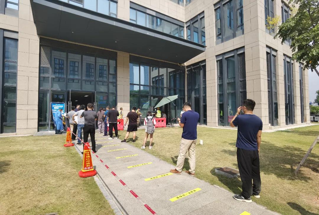 核酸采集現(xiàn)場,市民們?cè)诠ぷ魅藛T的現(xiàn)場督察引導(dǎo)下有序間隔一米排隊(duì),醫(yī)院的全民核酸采樣工作十分高效、有序。