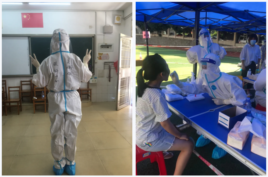 現(xiàn)在疫情當(dāng)?shù)?,雖然穿上防護(hù)服真的非常悶熱(他們說(shuō)這是缺氧套裝,笑),而且要在太陽(yáng)底下一直工作,對(duì)于我們醫(yī)護(hù)工作者來(lái)說(shuō)是個(gè)非常大的考驗(yàn)。但是聽(tīng)到女兒、市民們對(duì)我們說(shuō)一聲“辛苦了”,我就覺(jué)得什么都值得了。明天我還要來(lái)當(dāng)志愿者。廈門加油,我們一起加油!