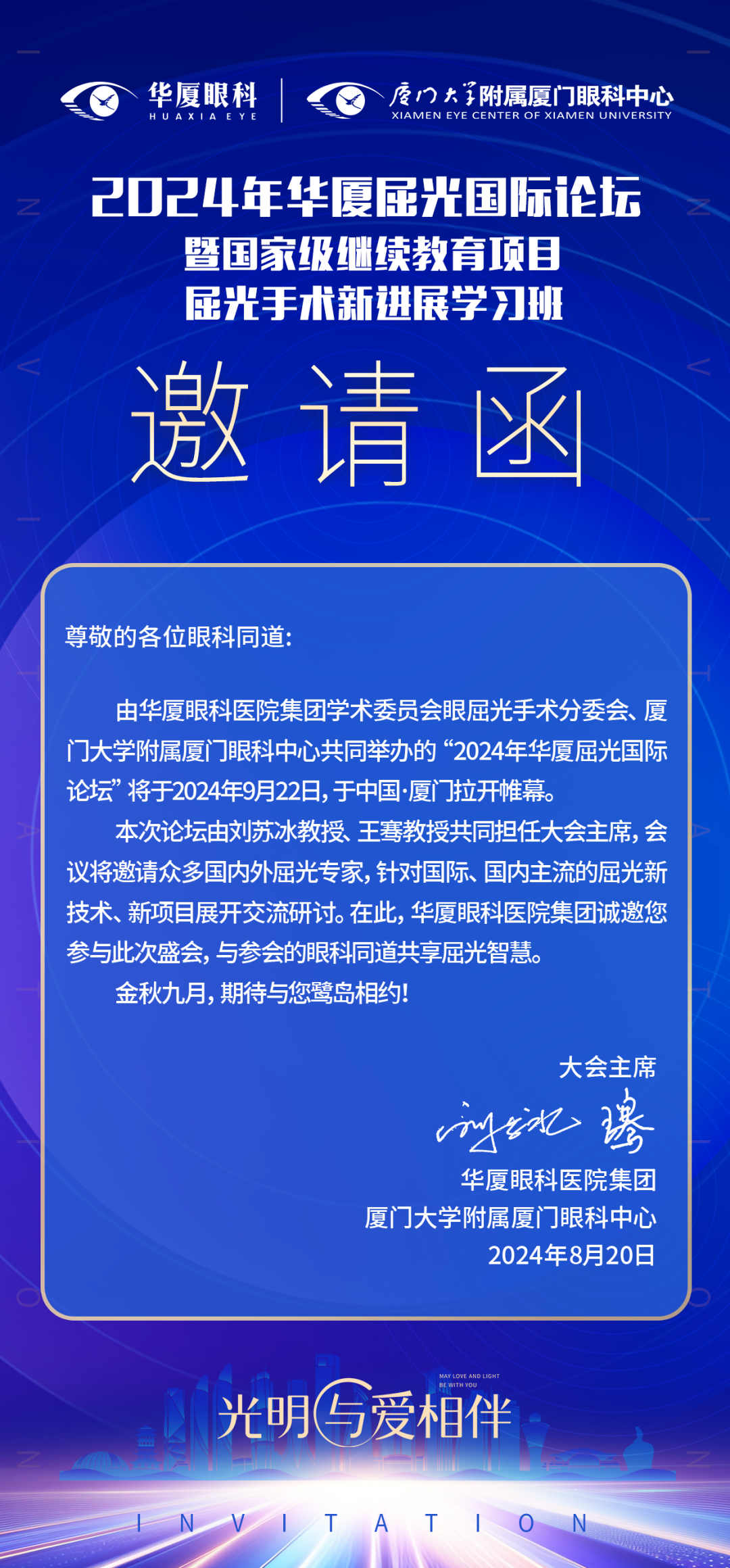 為進(jìn)一步推動(dòng)眼屈光領(lǐng)域的深入交流及屈光手術(shù)新發(fā)展,值金秋九月之際,由華廈眼科醫(yī)院集團(tuán)學(xué)術(shù)委員會(huì)眼屈光手術(shù)分委會(huì)、廈門大學(xué)附屬?gòu)B門眼科中心共同舉辦的“2024年華廈屈光國(guó)際論壇”暨國(guó)家級(jí)繼續(xù)教育項(xiàng)目“屈光手術(shù)新進(jìn)展學(xué)習(xí)班”將于2024年9月22日在風(fēng)景旖旎的鷺島·廈門舉行。